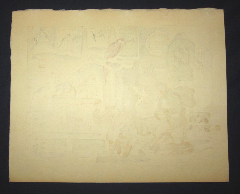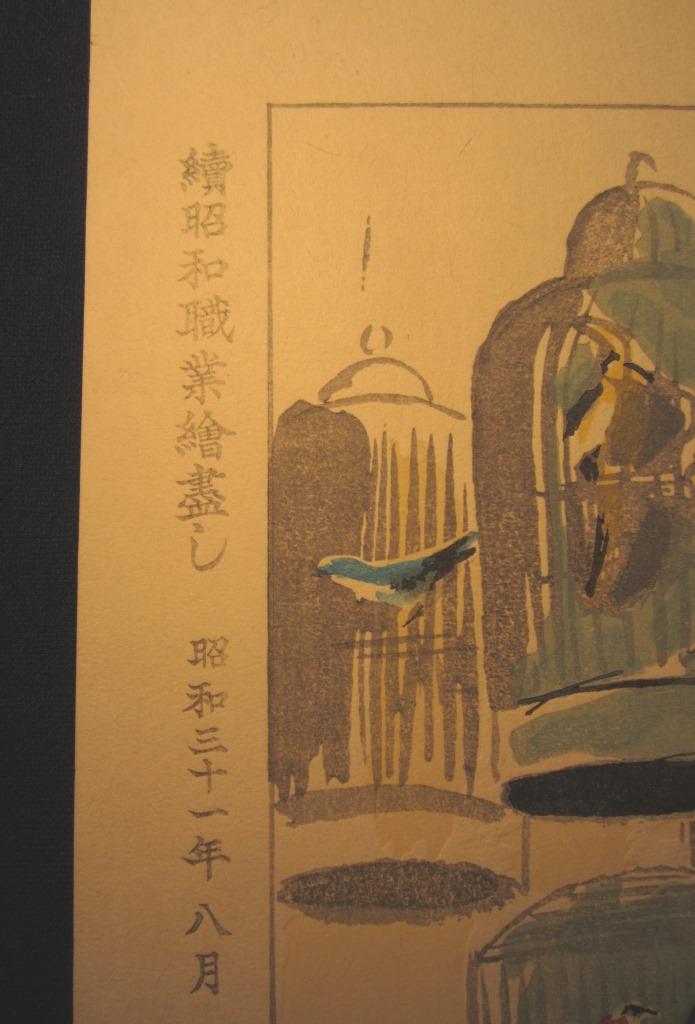 This is a very beautiful, special, Original-Edition and Limited-Number (number 113) original Japanese Shin Hanga woodblock print “Bird House” from the rare Series "Second Showa Professional Description" signed by the famous Japanese Shin Hanga woodblock print Master Wata Sanzo (1883 - 1968) published by the famous Kyoto Hanga Printmaker made in Showa 31 August, which is 1956 IN EXCELLENT CONDITION. This is an original woodblock print is about 70 years old. This woodblock print is from my family seven-decade Japanese woodblock prints and Asian Arts collections. The size of this ORIGINAL woodblock print 17 x 13 1/2 inches. The artist's signature, his chop mark and the title of the print is at the upper right corner of the print. The Series name "Showa Professional Description", the publication date "Showa 31 August (1956)", the Original Edition chop mark, the publisher Kyoto Hanga Printmaker chop mark, the Limited-number (113) and carver and printer's chop marks are in the left border. The colors, which are vivid and vibrant, are in layers. Four borders are intact. This woodblock print is not attached to any backing paper or cardboard and strong ink bleeding can be seen through the back of the original mulberry paper. As far as I can see, this original woodblock print is IN EXCELLENT CONDITION. Any credit card, visa, master card, bank and post office money order, cashier check and personal check are accepted. Personal checks will take about ten days to clear. Texas residents need to pay 8.25% tax. Shipping is $16 anywhere in US by USPS priority mail with insurance and tracking. International shipping charges are US$33 through 1st class airmail WITHOUT insurance, buyers will have to assume all the risks during the mailing. We do combined shipping. If more than one item is purchased at the same time, the highest shipping cost will be charged. All items will be shipped together. THIS IS AN ORIGINAL EDITION LIMITED-NUMBER (113) ORIGINAL JAPANESE WOODBLOCK PRINT SIGNED BY THE FAMOUS SHOWA SHIN HANGA WOODBLOCK PRINT MASTER WATA SANZO MADE IN AUGUST SHOWA 31 (1956). IT IS NOT A RE-CUT, REPRODUCTION, OR LITHO PRINT.(SF29_20250708S_20250129)