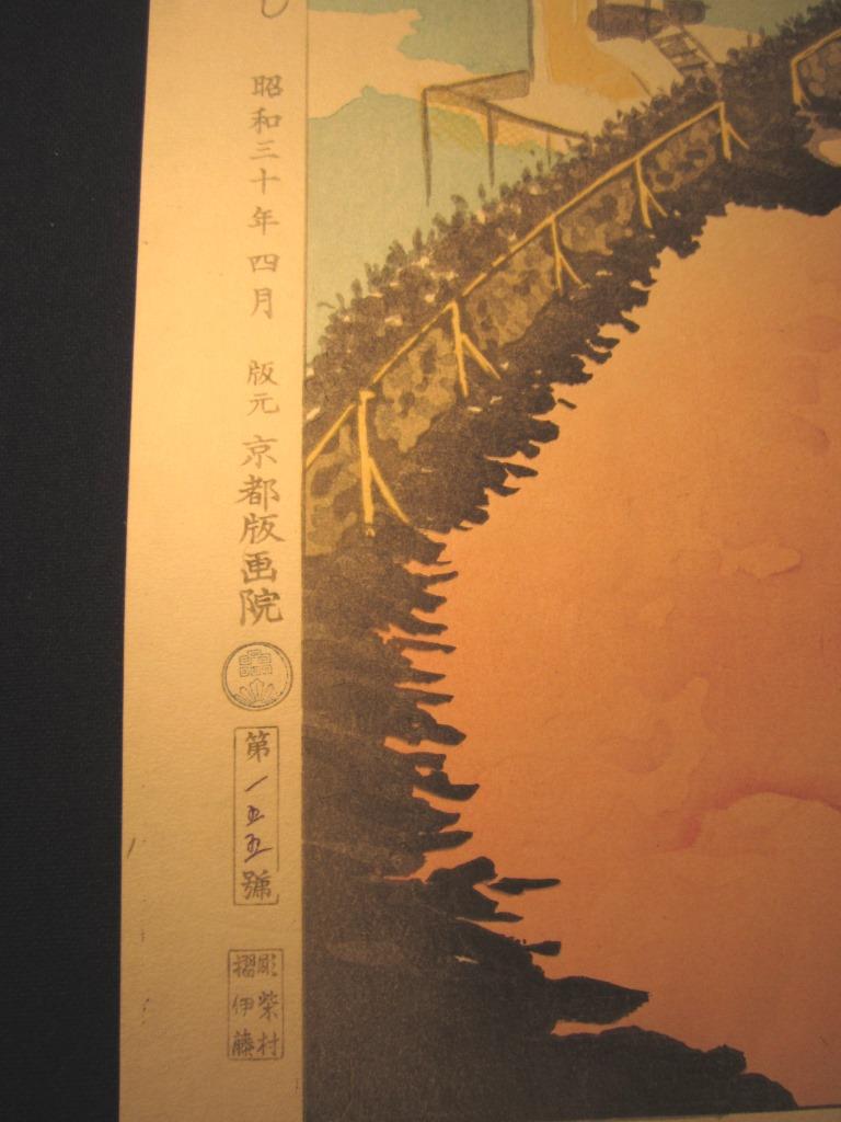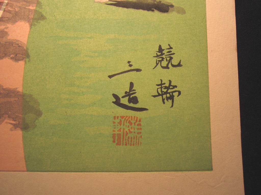 This is a very beautiful, special, Original-Edition and Limited-Number (number 155) original Japanese Shin Hanga woodblock print “Keirin Bicycle Race” from the rare Series "Second Showa Professional Description" signed by the famous Japanese Shin Hanga woodblock print Master Wata Sanzo (1883 - 1968) published by the famous Kyoto Hanga Printmaker made in Showa 30 April, which is 1955 IN EXCELLENT CONDITION. This is an original woodblock print is about 70 years old. This woodblock print is from my family seven-decade Japanese woodblock prints and Asian Arts collections. The size of this ORIGINAL woodblock print is 17 x 13 1/2 inches. The artist's signature, his chop mark and the title of the print is at the lower right corner of the print. The Series name "Second Showa Professional Description", the publication date "Showa 30 April (1955)", the Original Edition chop mark, the publisher Kyoto Hanga Printmaker chop mark, the Limited-number (155) and carver and printer's chop marks are in the left border. The colors, which are vivid and vibrant, are in layers. Four borders are intact. This woodblock print is not attached to any backing paper or cardboard and strong ink bleeding can be seen through the back of the original mulberry paper. As far as I can see, this original woodblock print is IN EXCELLENT CONDITION. Any credit card, visa, master card, bank and post office money order, cashier check and personal check are accepted. Personal checks will take about ten days to clear. Texas residents need to pay 8.25% tax. Shipping is $16 anywhere in US by USPS priority mail with insurance and tracking. International shipping charges are US$33 through 1st class airmail WITHOUT insurance, buyers will have to assume all the risks during the mailing. We do combined shipping. If more than one item is purchased at the same time, the highest shipping cost will be charged. All items will be shipped together. THIS IS AN ORIGINAL EDITION LIMITED-NUMBER (155) ORIGINAL JAPANESE WOODBLOCK PRINT SIGNED BY THE FAMOUS SHOWA SHIN HANGA WOODBLOCK PRINT MASTER WATA SANZO MADE IN APRIL SHOWA 30 (1955). IT IS NOT A RE-CUT, REPRODUCTION, OR LITHO PRINT.(SF29_20250708S_20250129)Keirin