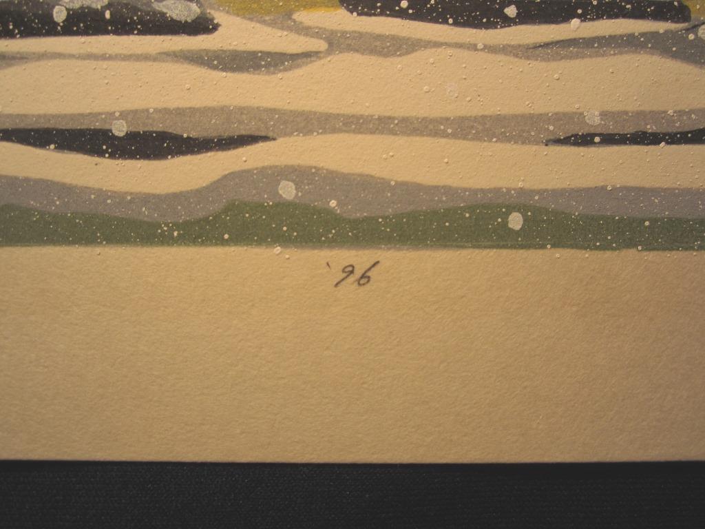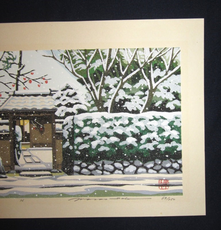 This is a HUGE very beautiful, special and LIMITED-NUMBER (69/250) original Japanese woodblock print “White Snow Winter” from his famous "Romantic Kyoto, where poetry meets painted beauty" series Pencil-Signed by the famous Showa Shin Hanga woodblock print master Masado Ido (1945-2016) made in 1996 IN EXCELLENT CONDITION. This is an original woodblock print about 30 years old. This woodblock print is from my family seven-decade Japanese woodblock prints and Asian Arts collections. To see more on my family Japanese woodblock, print collections, please search for shinhangagallery.com. The size of this print is 20 1/4 x 11 inches, which is MUCH LARGER than the traditional Shin Hanga woodblock prints. The artist’s chop mark is at the lower right corner of the print while the artist's Pencil signature, LIMITED-NUMBER (69/250), the publication date 1996 and title of this ORIGINAL woodblock print “White Snow Winter” are in the bottom border. The colors, which are vivid and vibrant, are in layers on the original Japanese Washi paper. This ORIGINAL woodblock print is not attached to any backing paper or cardboard and strong ink bleeding can be seen through the back of the original Japanese Mulberry paper. Four borders are intact. This ORIGINAL Japanese woodblock print is IN EXCELLENT CONDITION. Shipping is $16 dollars anywhere in US via USPS priority mail with insurance and tracking. International shipping charges are US$33 through airmail WITHOUT insurance, buyers will have to assume all the risks during the mailing. We do combined shipping. If more than one item is purchased at the same time, the highest shipping cost will be charged. THIS IS A HUGE LIMITED-NUMBER (69/250) ORIGINAL JAPANESE WOODBLOCK PRINT PENCIL SIGNED BY THE FAMOUS SHOWA SHIN HANGA WOODBLOCK PRINT MASTER MASAO IDO MADE IN 1996. IT IS NOT A RE-CUT, REPRODUCTION, OR LITHO PRINT. (SF29_20250708_20240625_3)