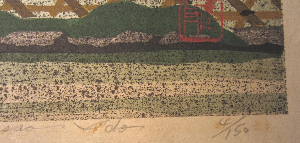This is a very beautiful, special and LIMITED-NUMBER (4/150) original Japanese woodblock print Koetsu-Ji Temple from his famous series "Kyoto Sentiment" PENCIL SIGNED by the famous Showa Shin Hanga woodblock print master Masado Ido (1945-2016) made in 1981. This is an original woodblock print about 44 years old. This woodblock print is from my family seven-decade Japanese woodblock prints and Asian Arts collections. To see more on my family Japanese woodblock, print collections, please search for shinhangagallery.com. The size of this print is 16 1/2 x 12 inches, which is LARGER than the traditional Shin Hanga woodblock prints. The artist’s chop mark is at the lower right corner of the print while the artist's Pencil signature, LIMITED-NUMBER (14/150), the publication date 1981 and title Koetsu-Ji Temple of this ORIGINAL woodblock print are in the bottom border. The colors, which are vivid and vibrant, are in layers on the original Japanese Washi paper. This ORIGINAL woodblock print is not attached to any backing paper or cardboard and strong ink bleeding can be seen through the back of the original Japanese Mulberry paper. Four borders are intact. Except for some very minor foxing in the borders, this original woodblock print is in good condition. Shipping is $16 dollars anywhere in US via USPS priority mail with insurance and tracking. International shipping charges are US$33 through airmail WITHOUT insurance, buyers will have to assume all the risks during the mailing. We do combined shipping. If more than one item is purchased at the same time, the highest shipping cost will be charged. THIS IS A LIMITED-NUMBER (4/150) ORIGINAL JAPANESE WOODBLOCK PRINT PENCIL SIGNED BY THE FAMOUS SHOWA SHIN HANGA WOODBLOCK PRINT MASTER MASAO IDO MADE IN 1981. IT IS NOT A RE-CUT, REPRODUCTION, OR LITHO PRINT. (SF29_20250708S_20251115_1)