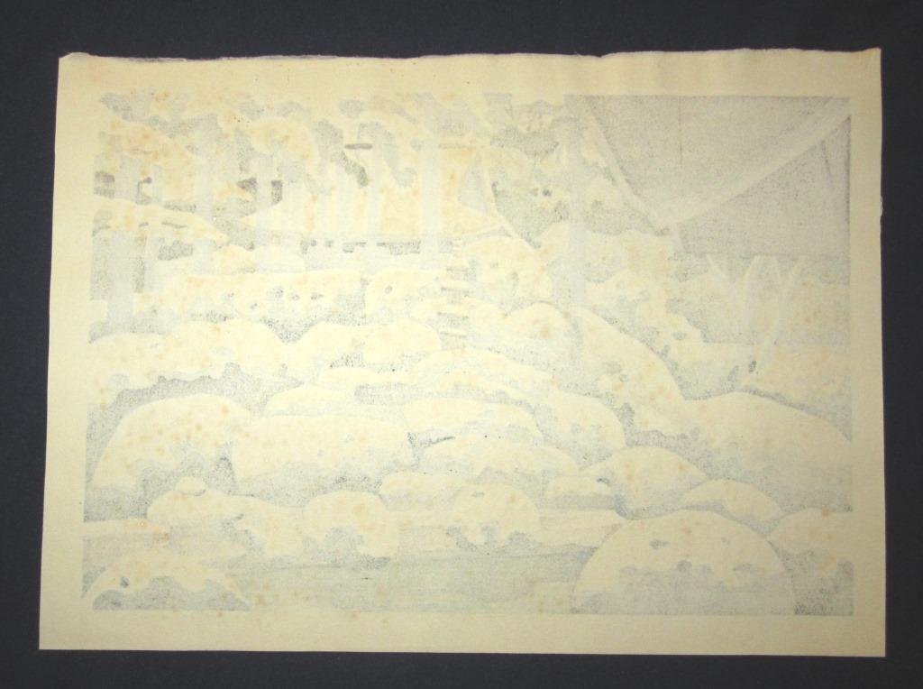 This is a very beautiful, special and LIMITED-NUMBER (4/150) original Japanese woodblock print Temple Winter from his famous series "Kyoto Sentiment" PENCIL SIGNED by the famous Showa Shin Hanga woodblock print master Masado Ido (1945-2016) made in 1981. This is an original woodblock print about 44 years old. This woodblock print is from my family seven-decade Japanese woodblock prints and Asian Arts collections. To see more on my family Japanese woodblock, print collections, please search for shinhangagallery.com. The size of this print is 16 1/2 x 12 inches, which is LARGER than the traditional Shin Hanga woodblock prints. The artist’s chop mark is at the lower right corner of the print while the artist's Pencil signature, LIMITED-NUMBER (4/150), the publication date 1981 and title Temple Winter of this ORIGINAL woodblock print are in the bottom border. The colors, which are vivid and vibrant, are in layers on the original Japanese Washi paper. This ORIGINAL woodblock print is not attached to any backing paper or cardboard and strong ink bleeding can be seen through the back of the original Japanese Mulberry paper. Four borders are intact. Except for some very minor foxing in the borders, this original woodblock print is in good condition. Shipping is $16 dollars anywhere in US via USPS priority mail with insurance and tracking. International shipping charges are US$33 through airmail WITHOUT insurance, buyers will have to assume all the risks during the mailing. We do combined shipping. If more than one item is purchased at the same time, the highest shipping cost will be charged. THIS IS A LIMITED-NUMBER (4/150) ORIGINAL JAPANESE WOODBLOCK PRINT PENCIL SIGNED BY THE FAMOUS SHOWA SHIN HANGA WOODBLOCK PRINT MASTER MASAO IDO MADE IN 1981. IT IS NOT A RE-CUT, REPRODUCTION, OR LITHO PRINT. (SF29_20250708S_20251115_6)